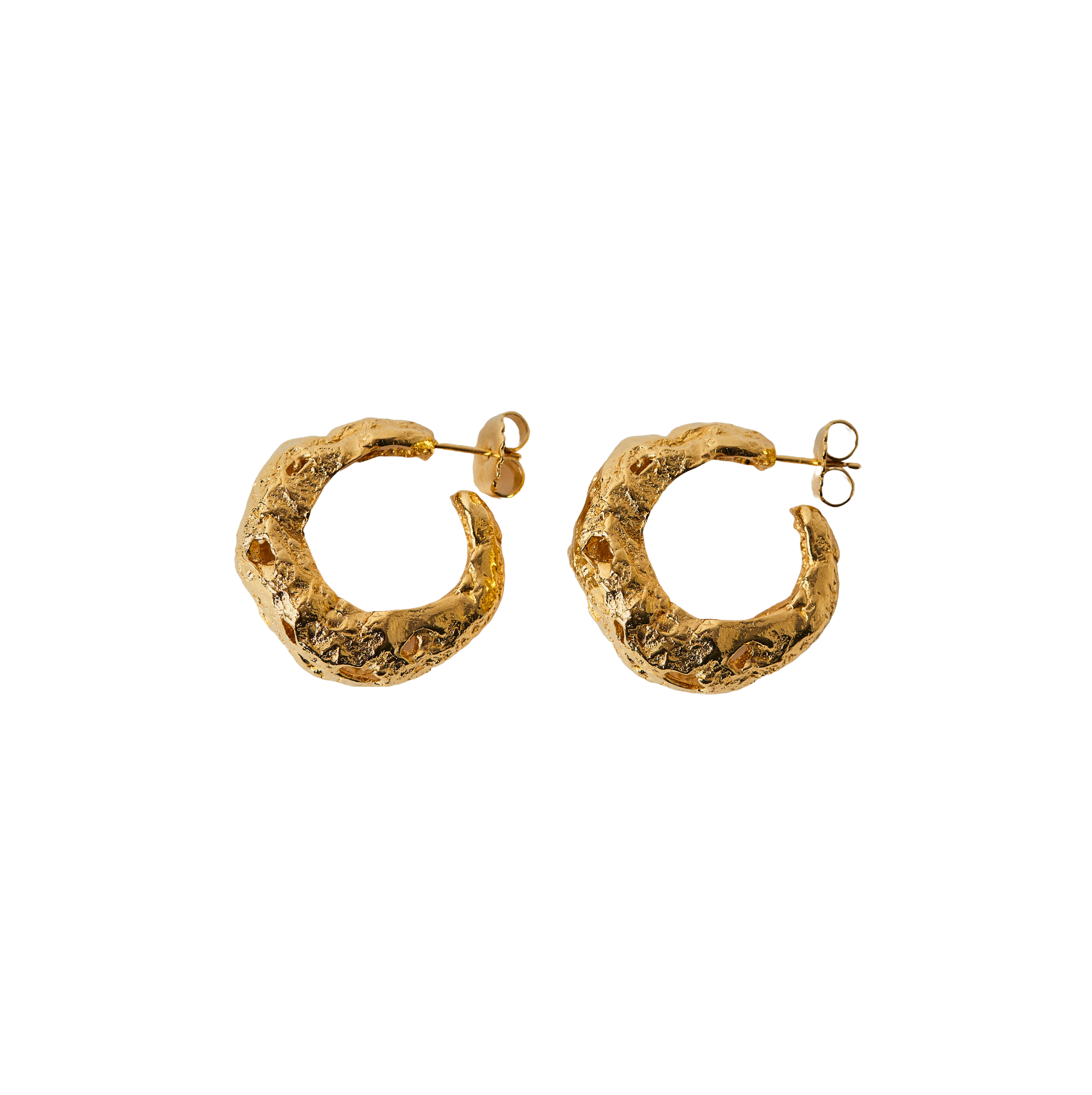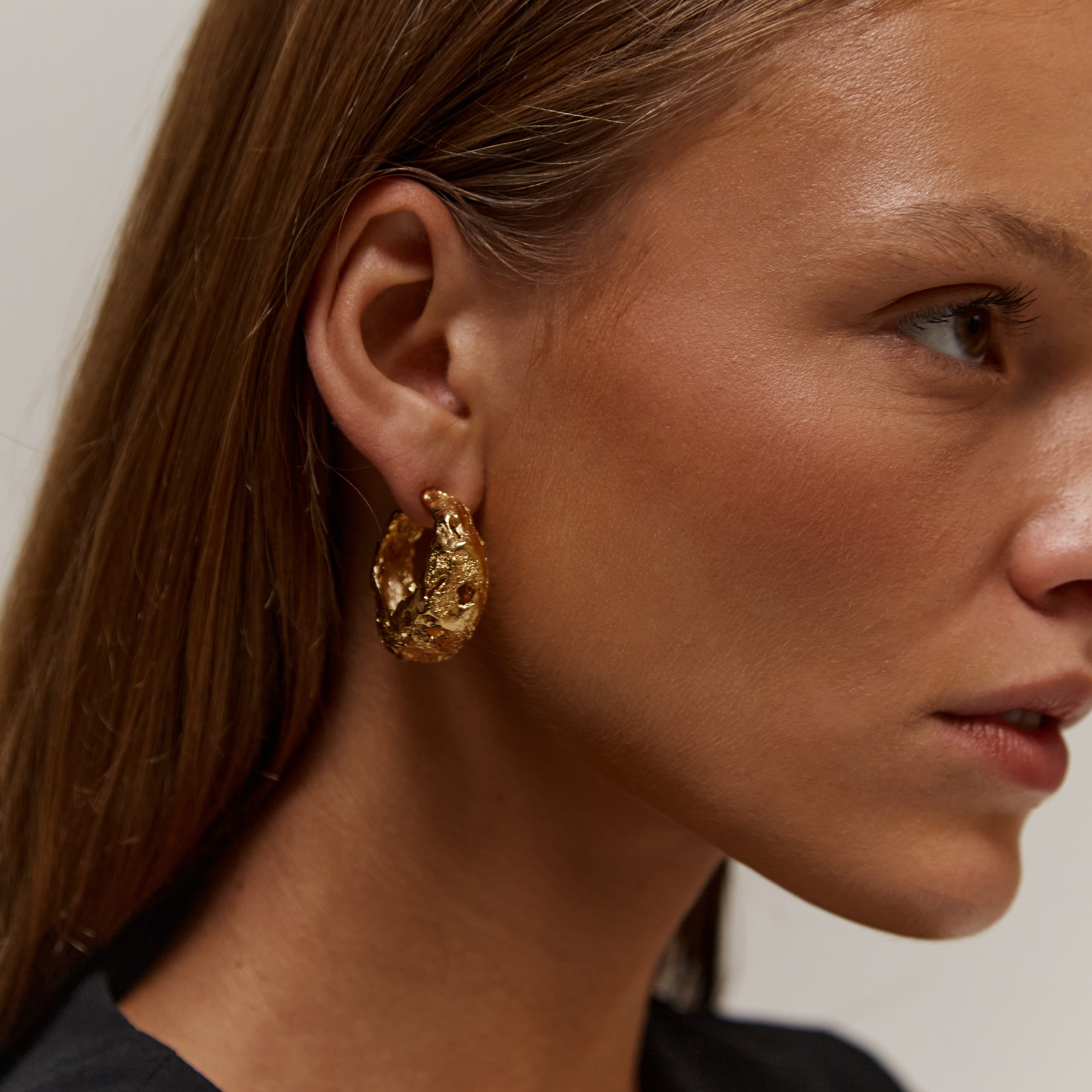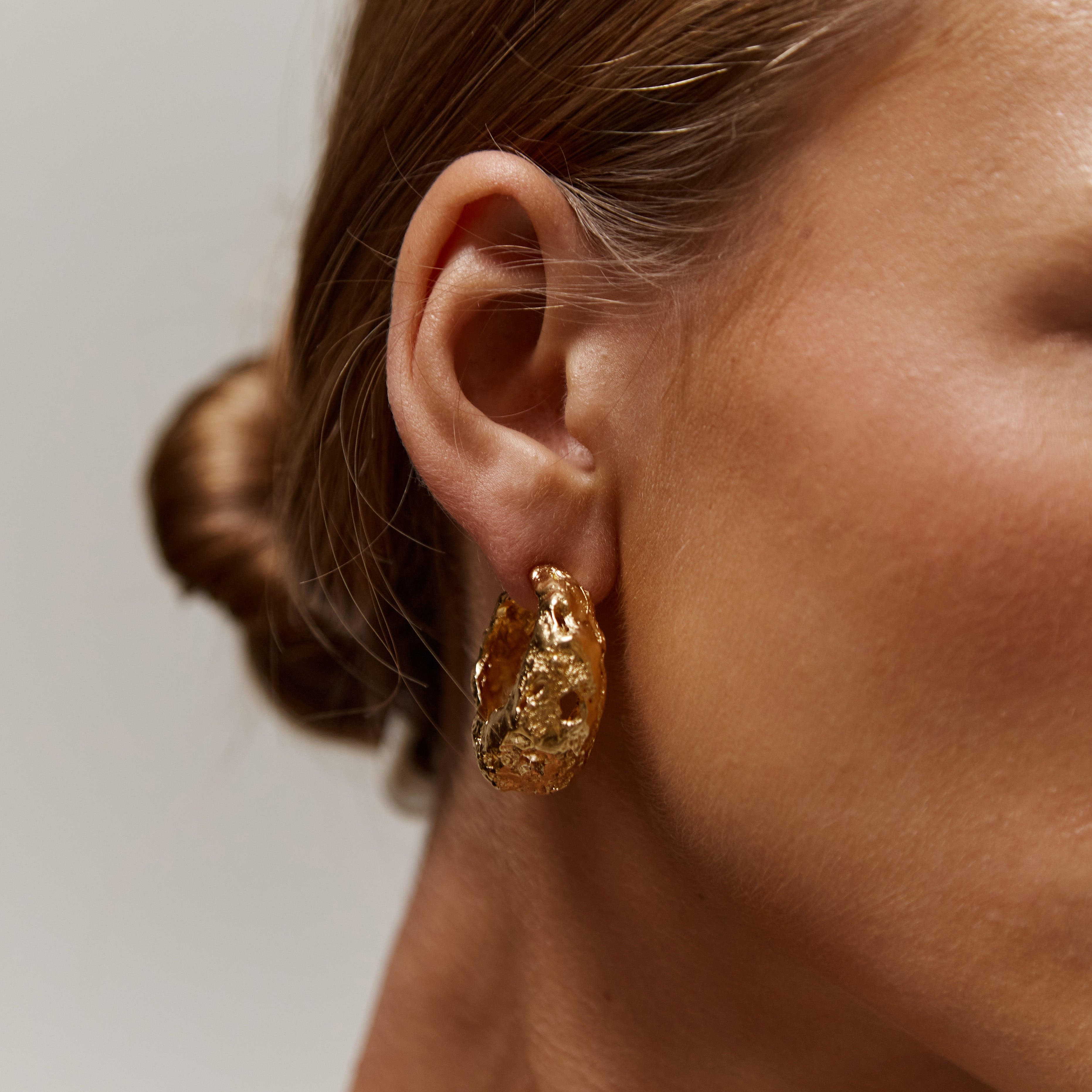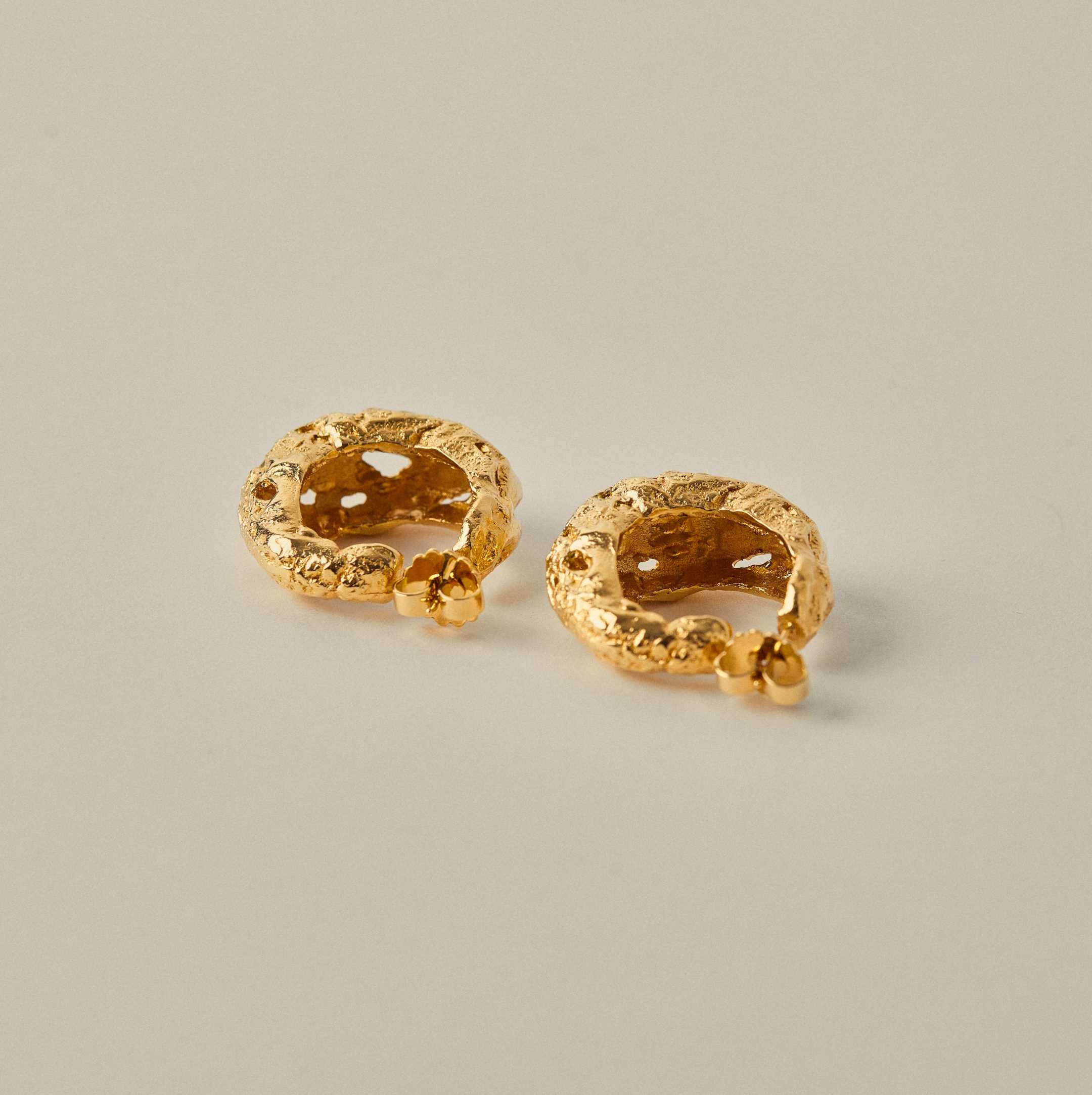 Make a fashion statement with these textured handmade earrings, expertly crafted in 18kt gold plated pewter metal. Let your individuality shine with these unique earrings, designed to add a touch of contemporary flair to any outfit.