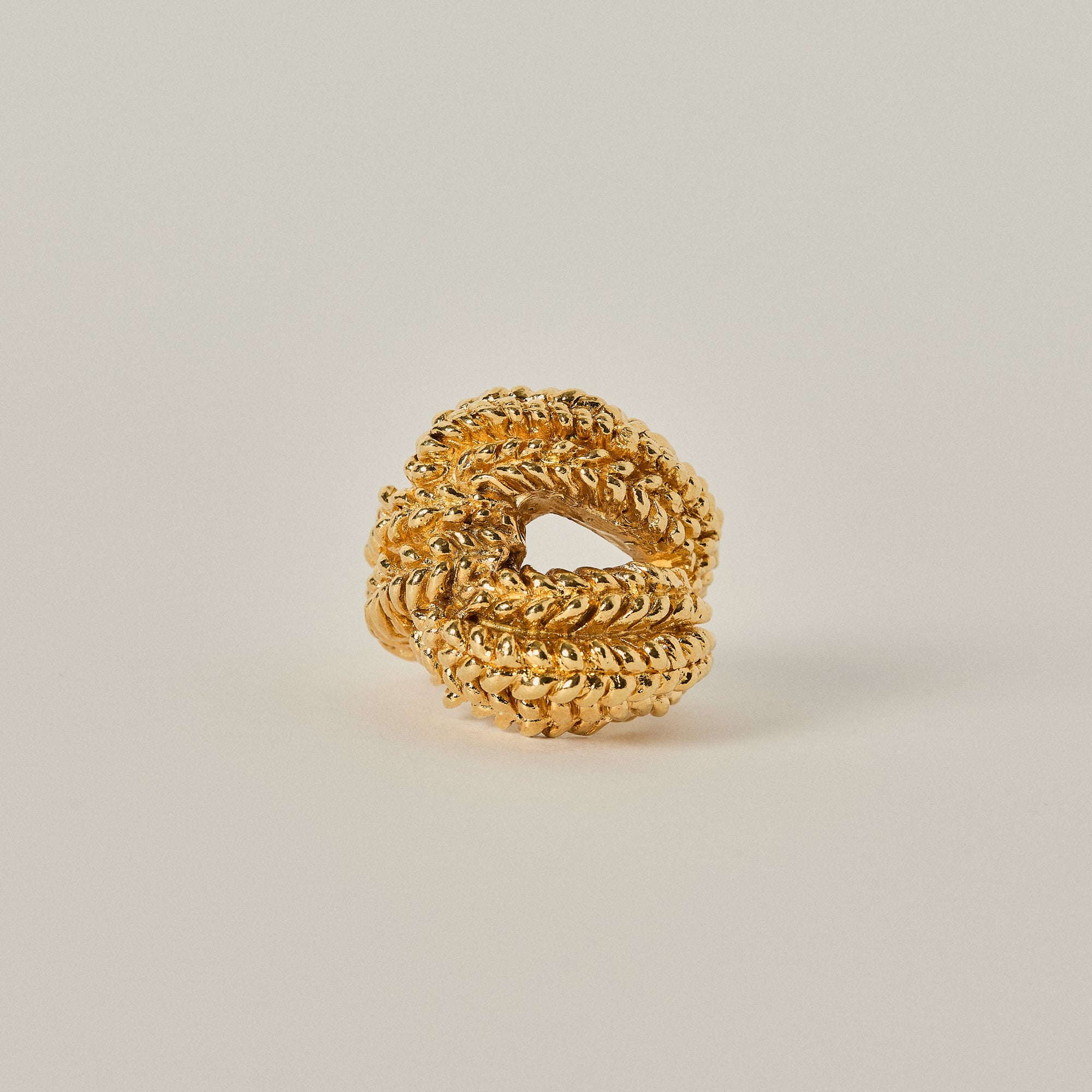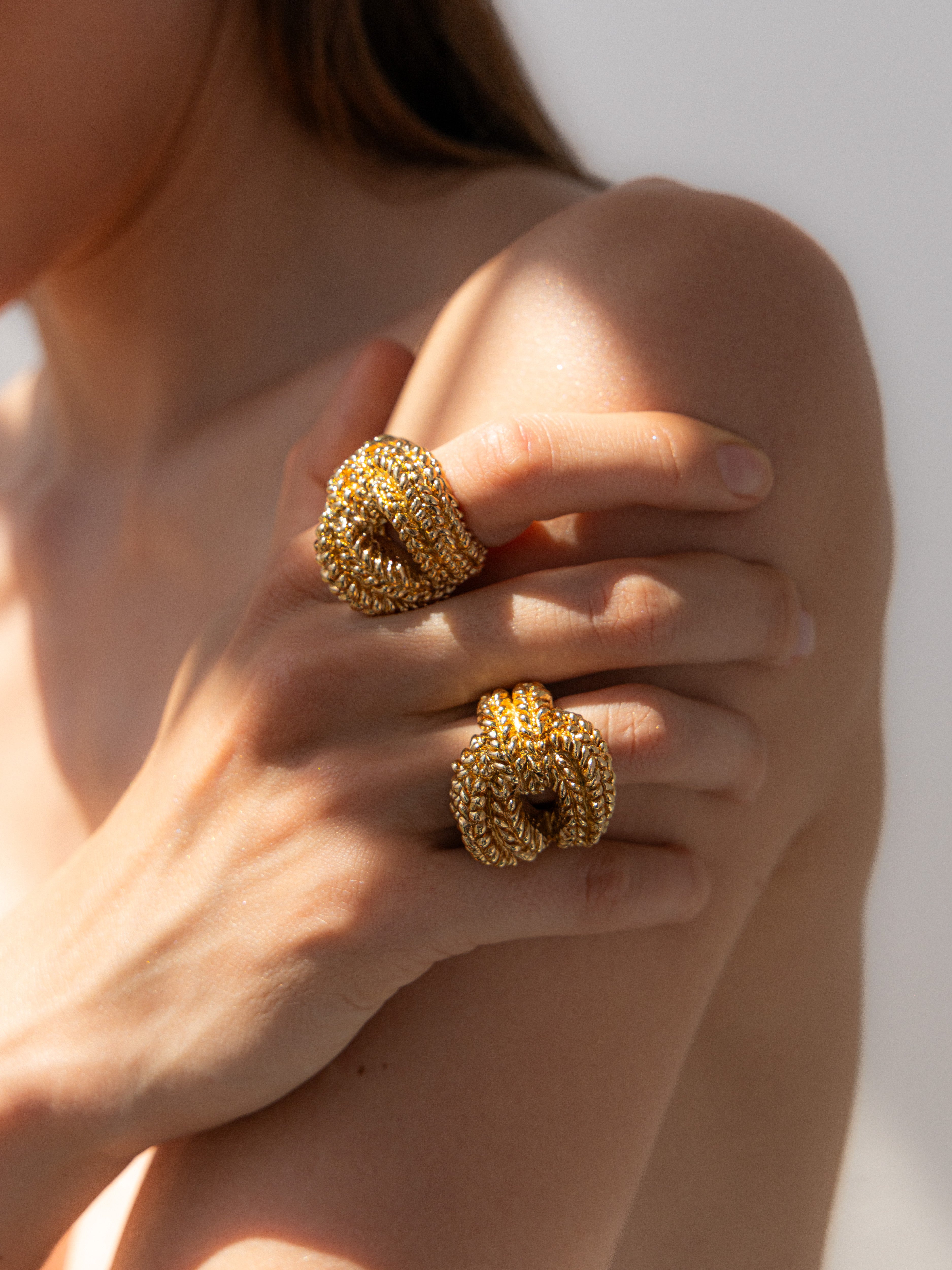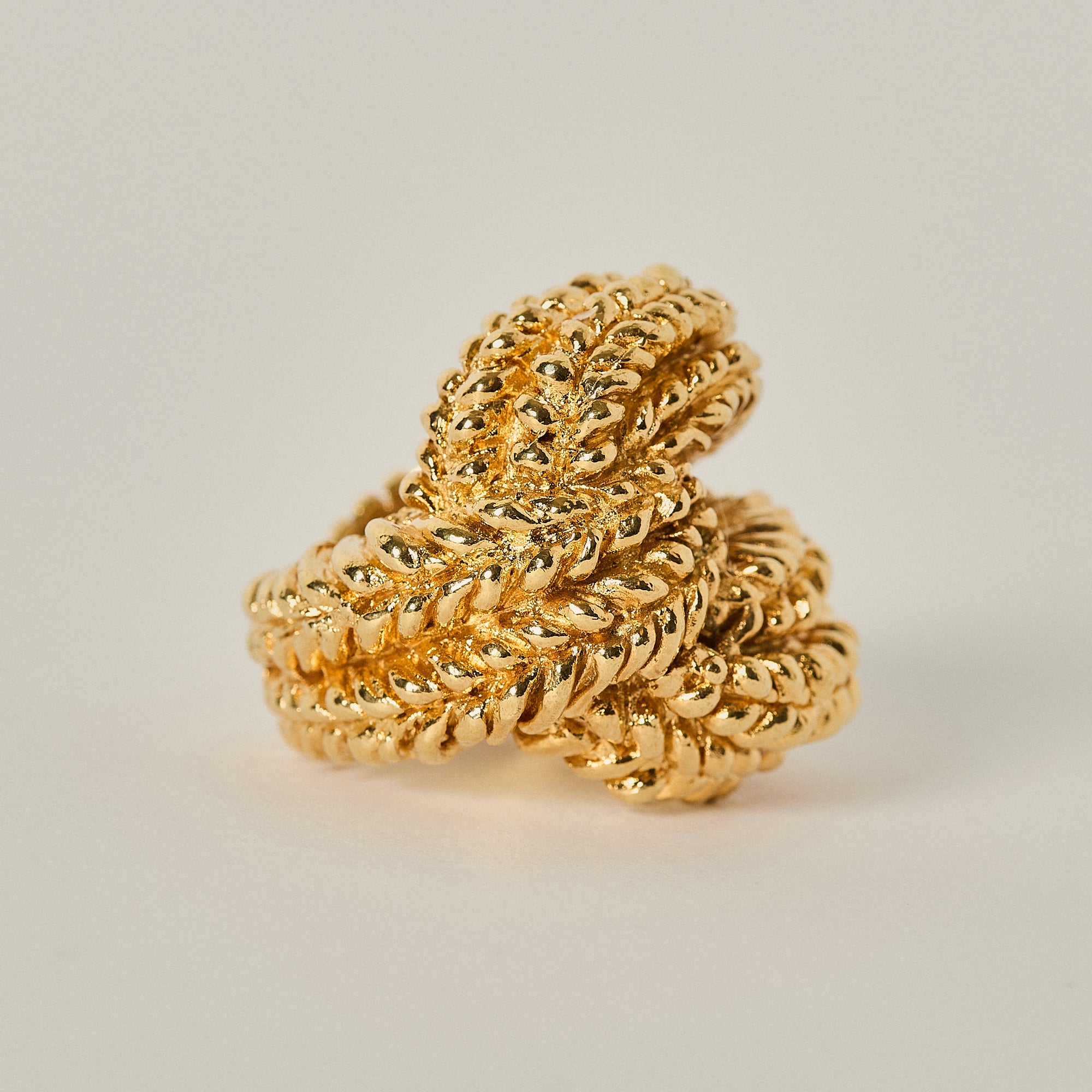 This piece offers endless styling possibilities, upgrade your ensemble with this versatile handmade 18kt gold plated textured pewter metal knot ring. Empowering you to express your unique sense of style with confidence and flair.
