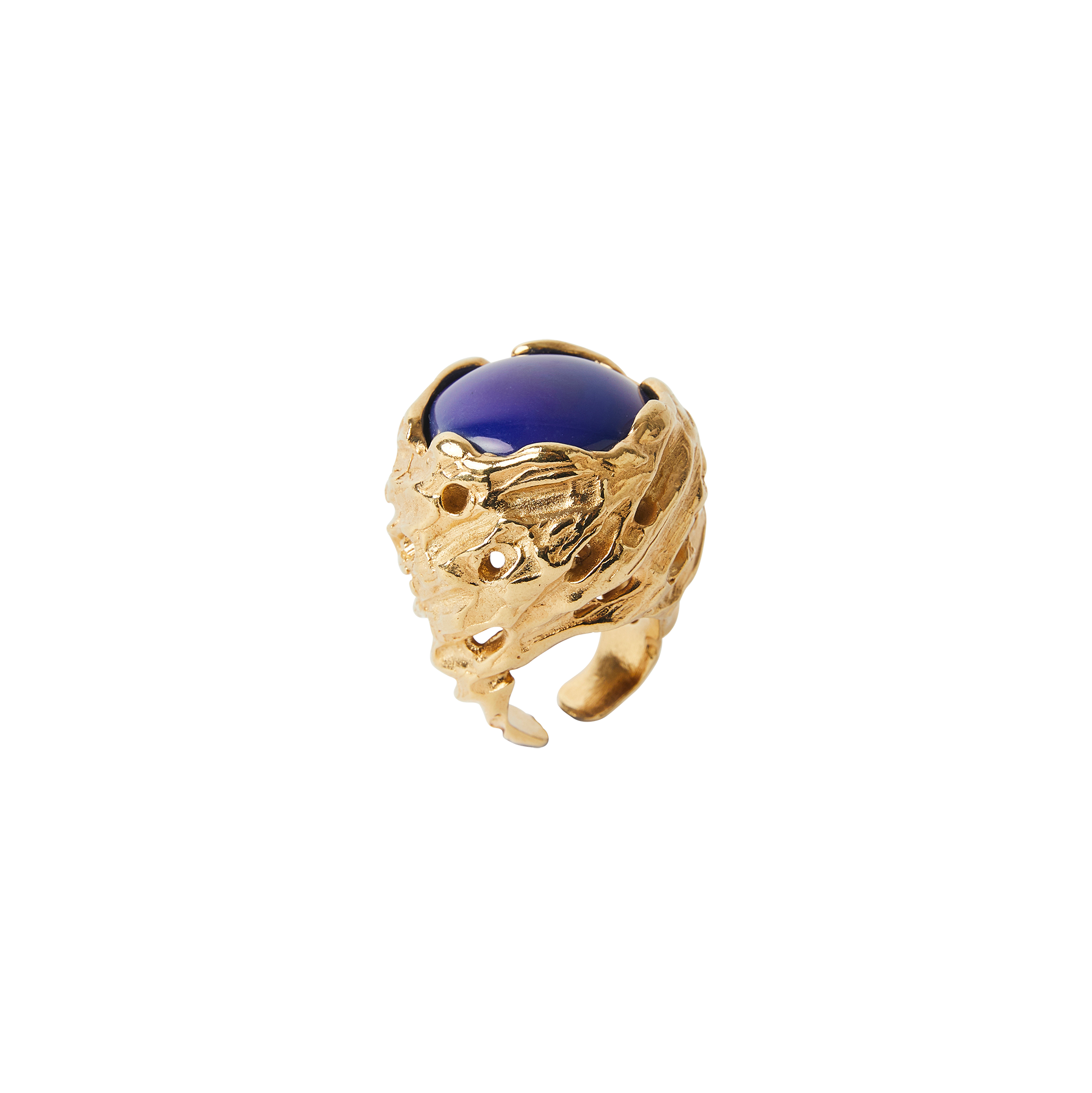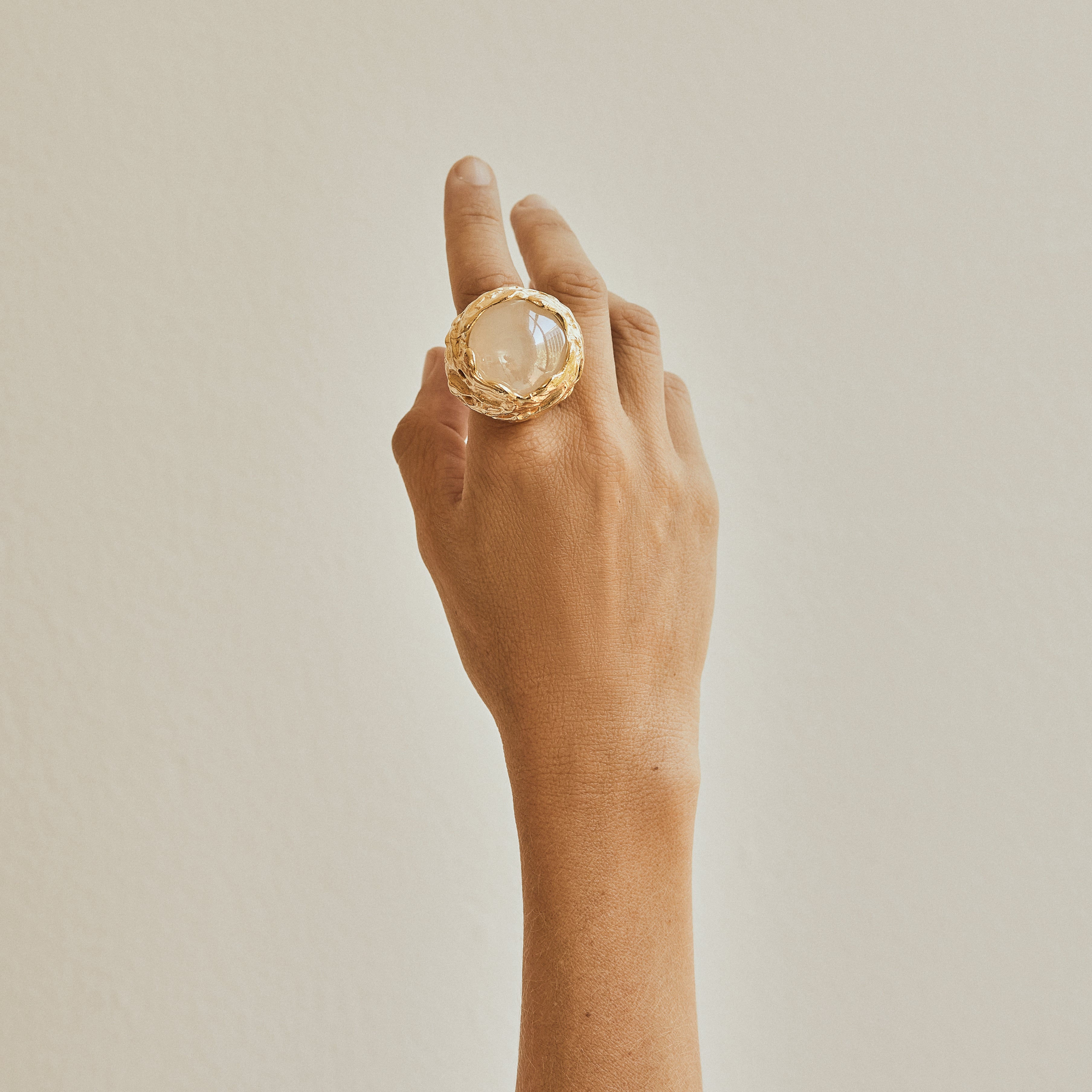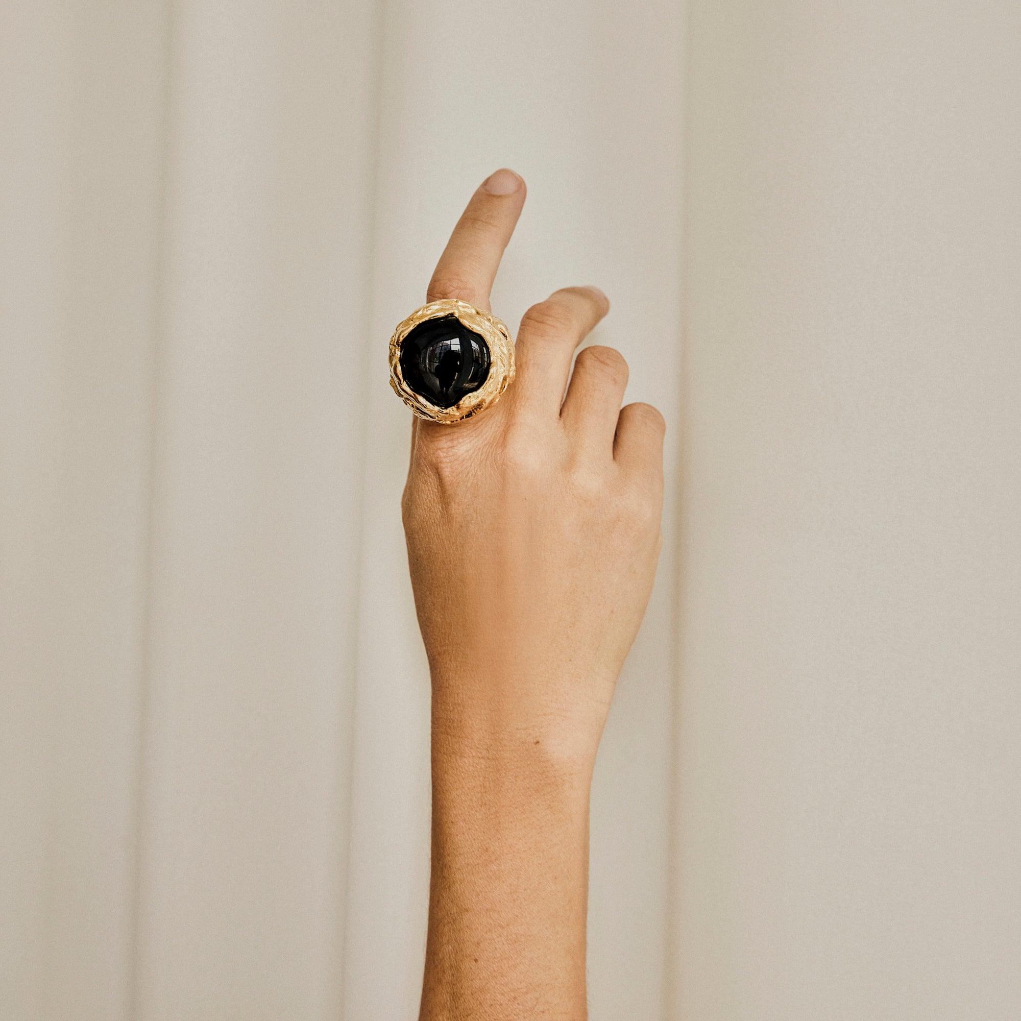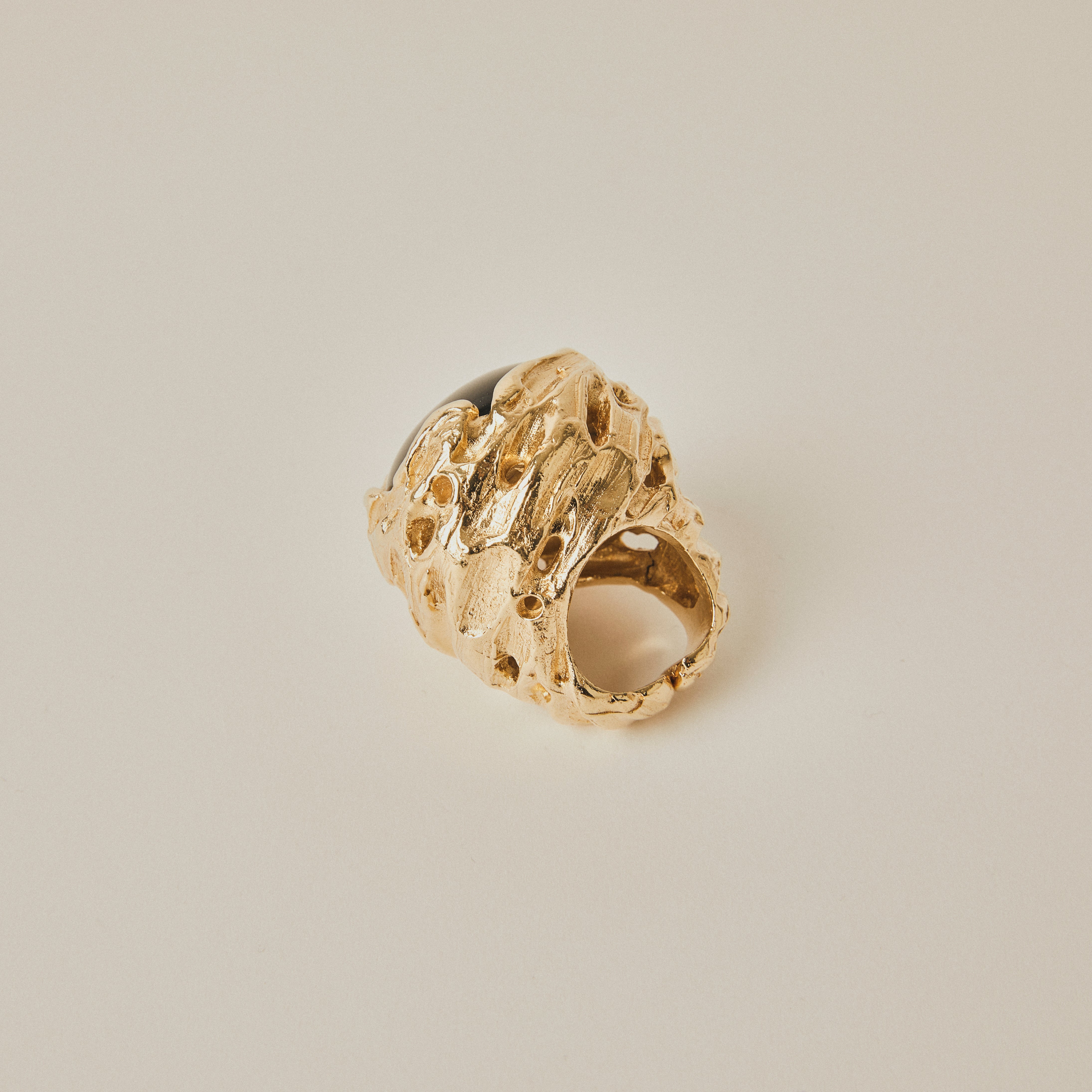 Make a bold impression with this striking XXL statement ring, featuring intricate textures carved in 18kt gold plated pewter metal and accented with a handmade color crystal. Let this ring be your signature accessory, symbolizing your bold and fearless approach to life, while adding a touch of drama and intrigue to your look, ensuring you leave a lasting impression wherever you go.