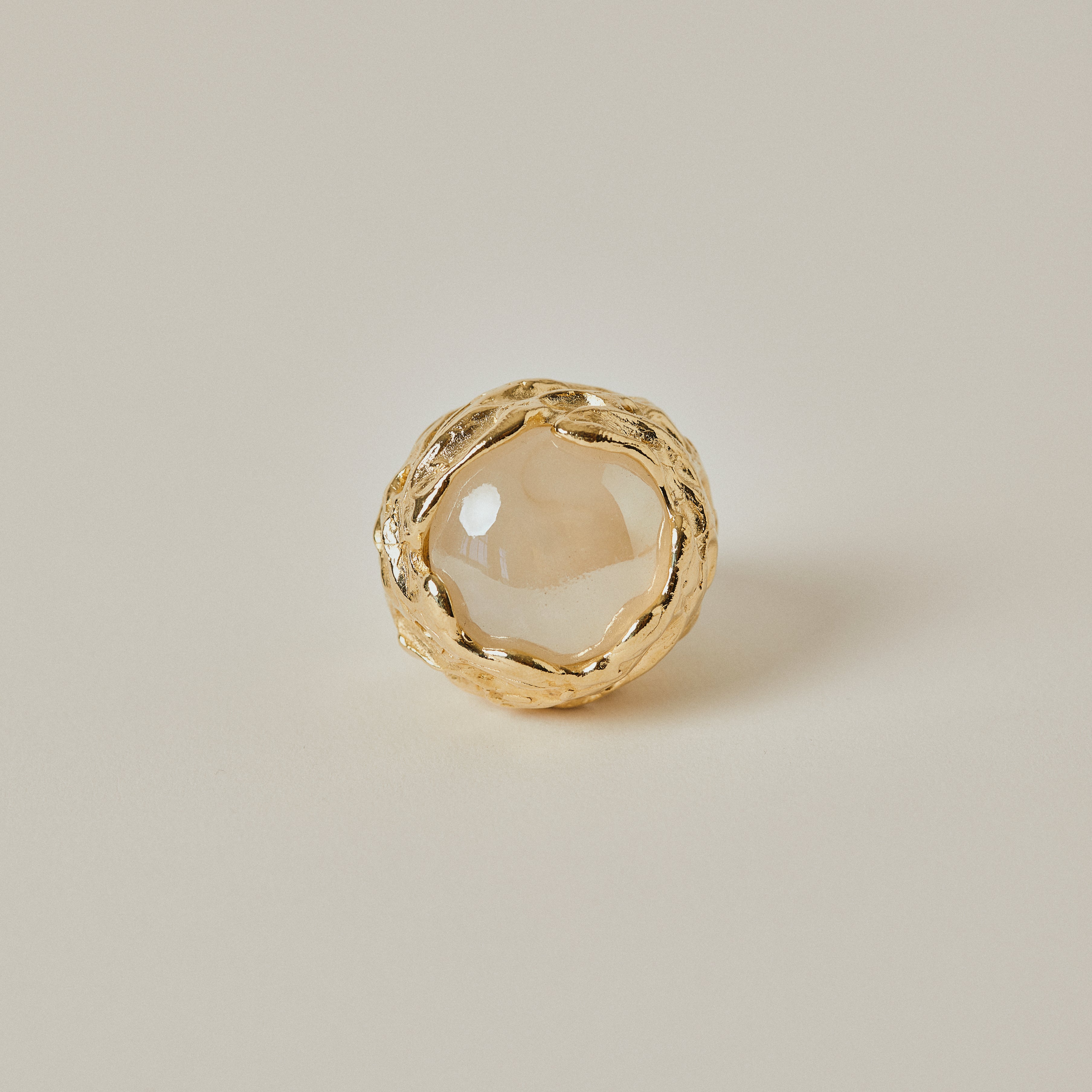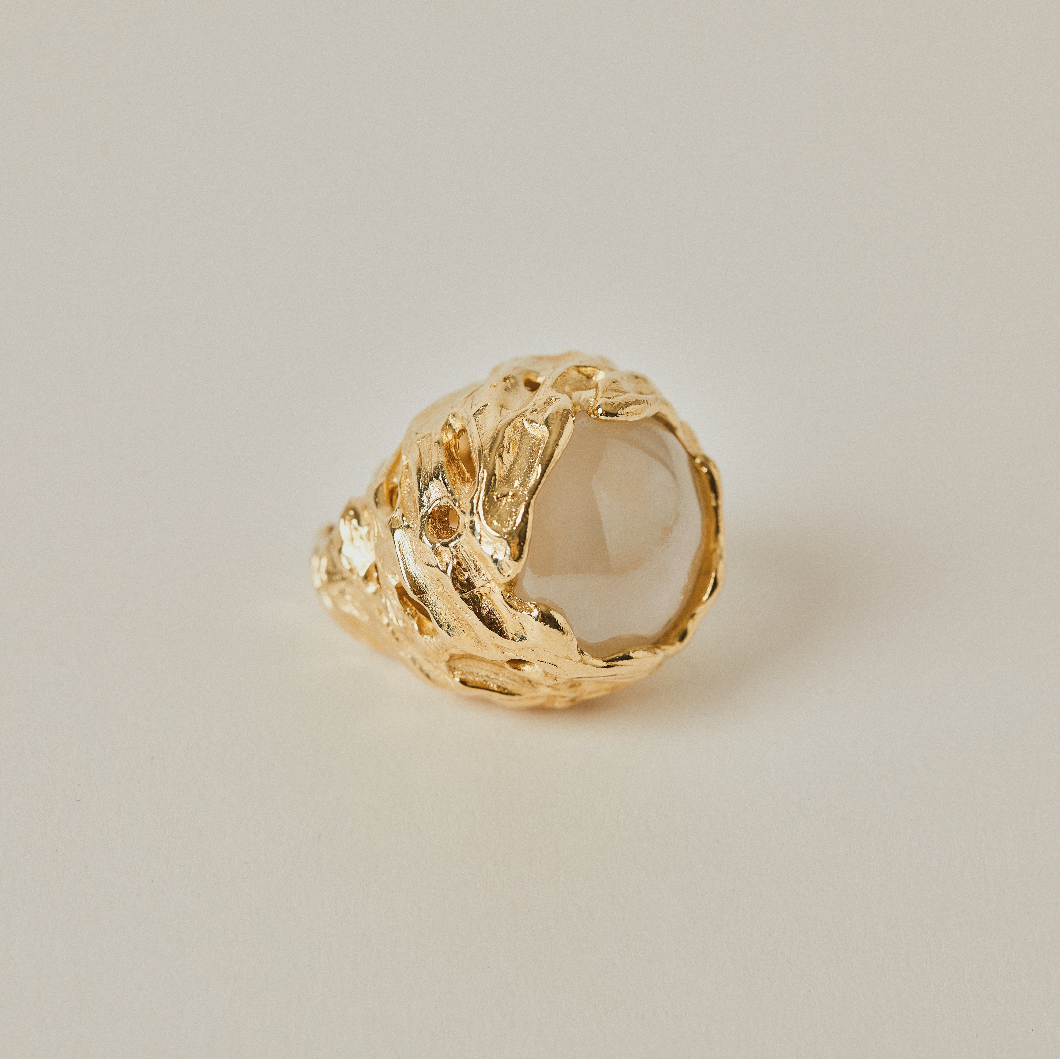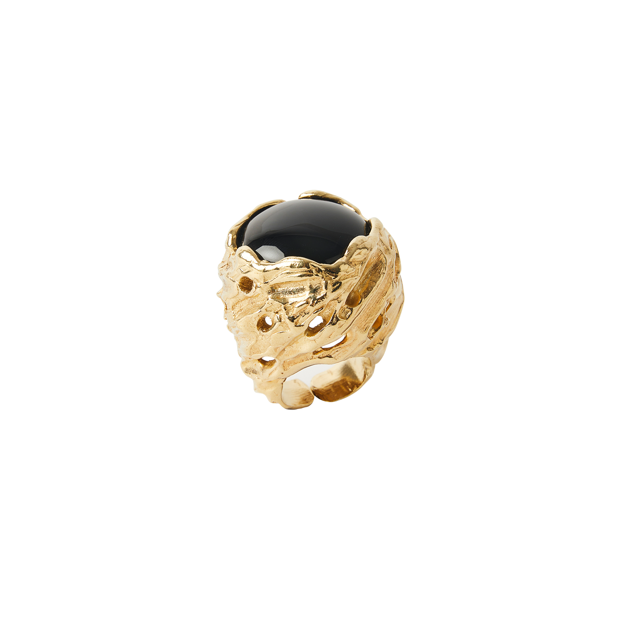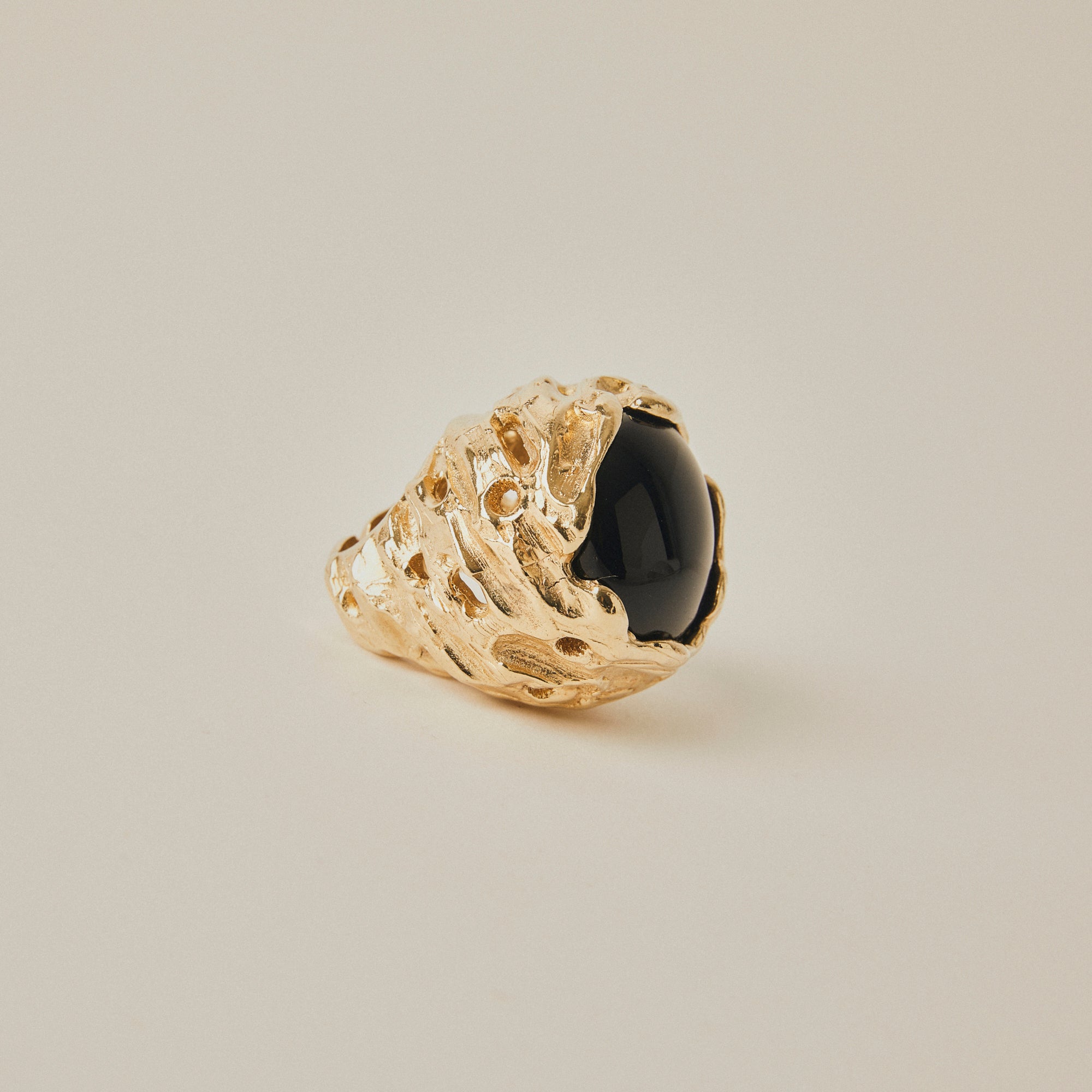 Make a bold impression with this striking XXL statement ring, featuring intricate textures carved in 18kt gold plated pewter metal and accented with a handmade color crystal. Let this ring be your signature accessory, symbolizing your bold and fearless approach to life, while adding a touch of drama and intrigue to your look, ensuring you leave a lasting impression wherever you go.