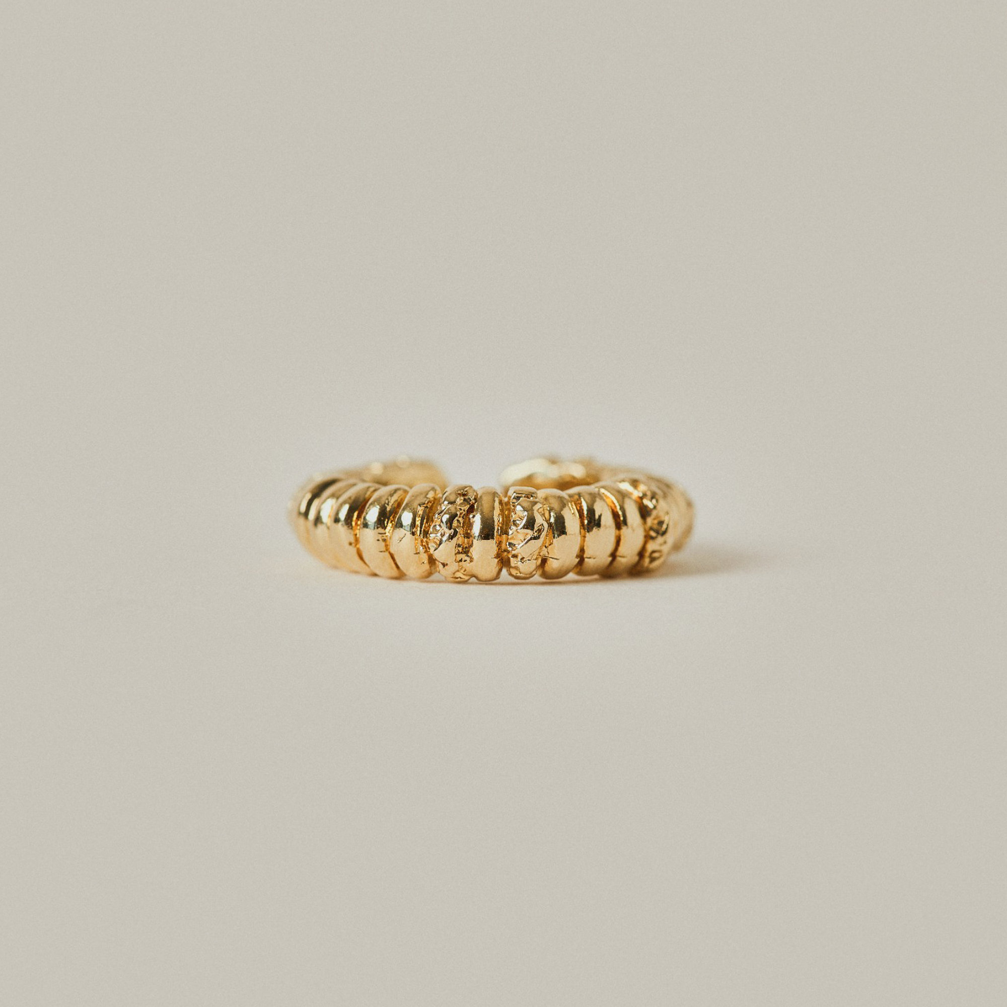 Upgrade your ensemble with this versatile handmade 18kt gold plated textured pewter metal ring/ear cuff. Wear it as a ring or as an ear cuff, this piece offers endless styling possibilities, empowering you to express your unique sense of style with confidence and flair.