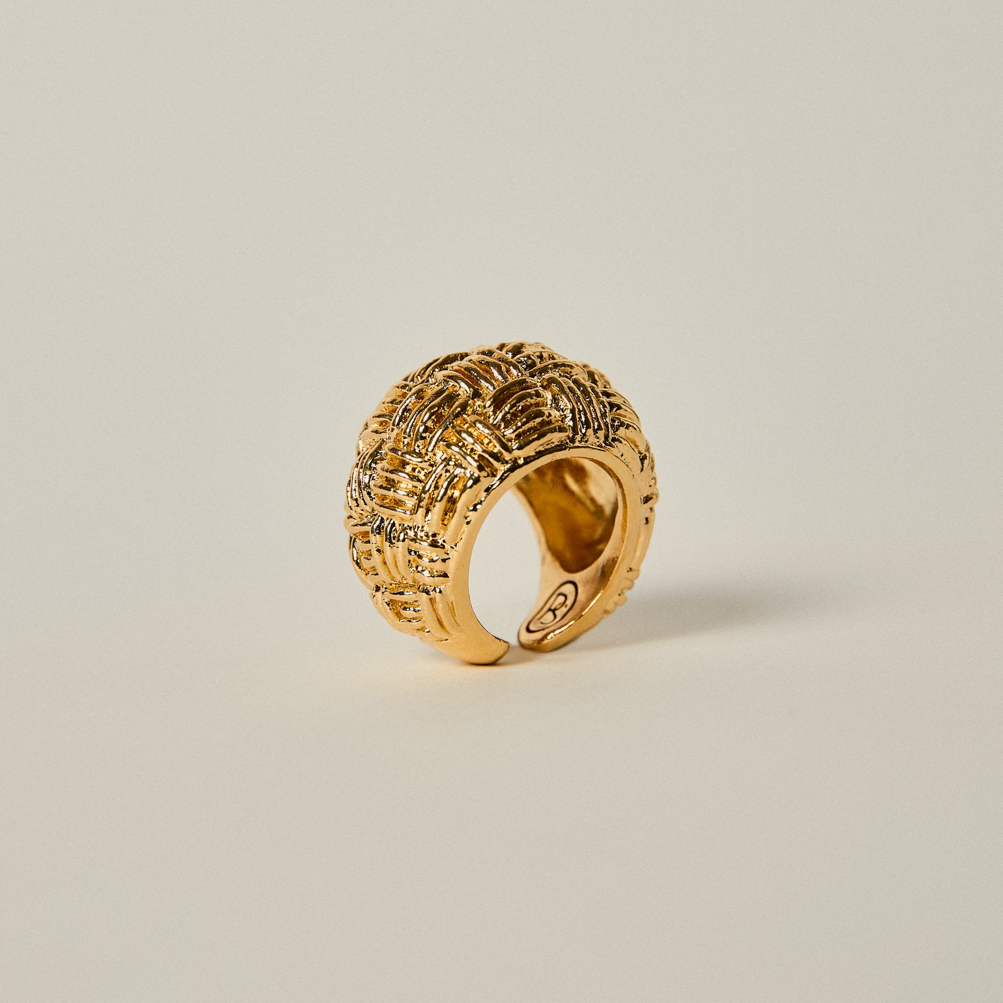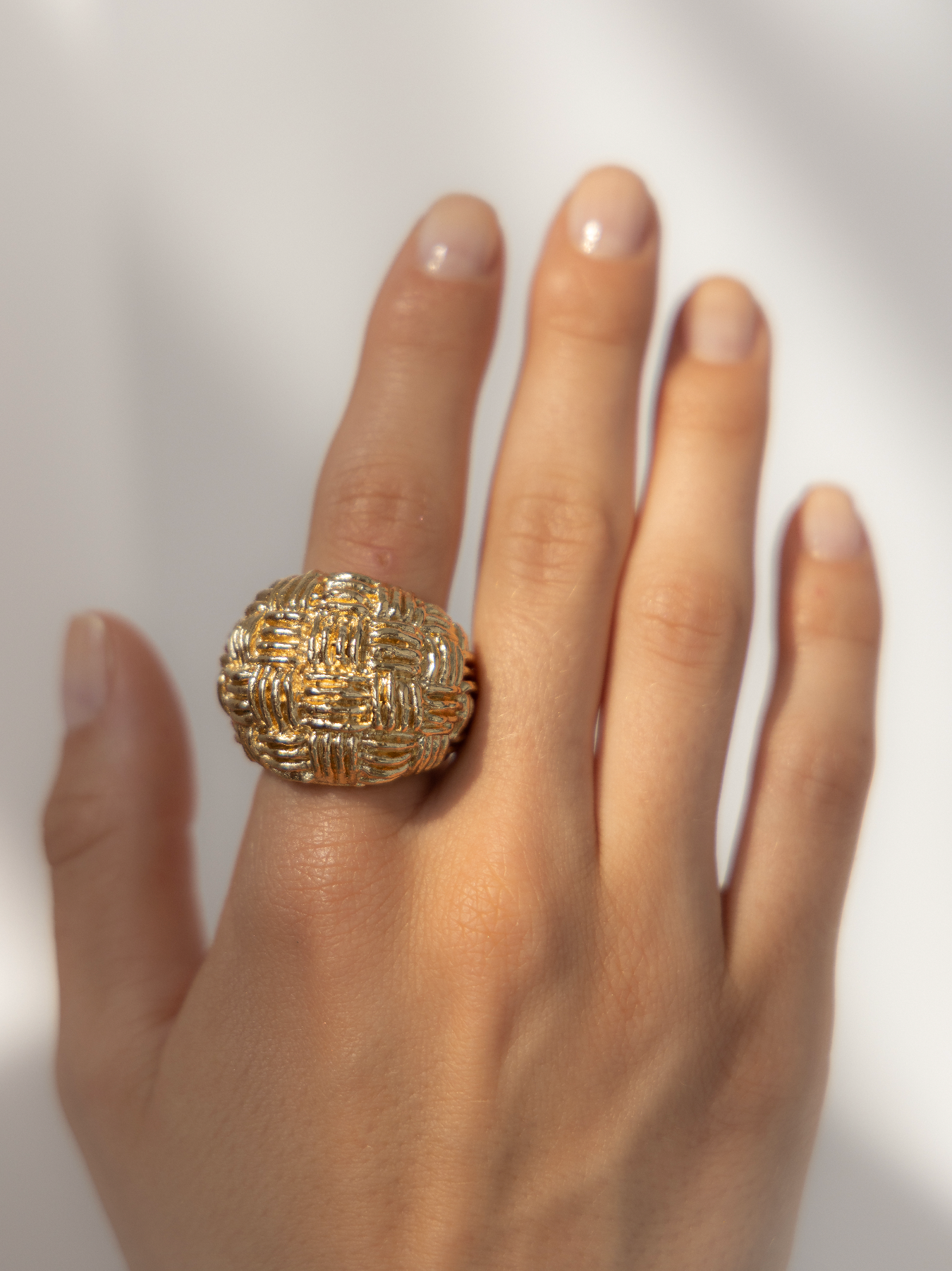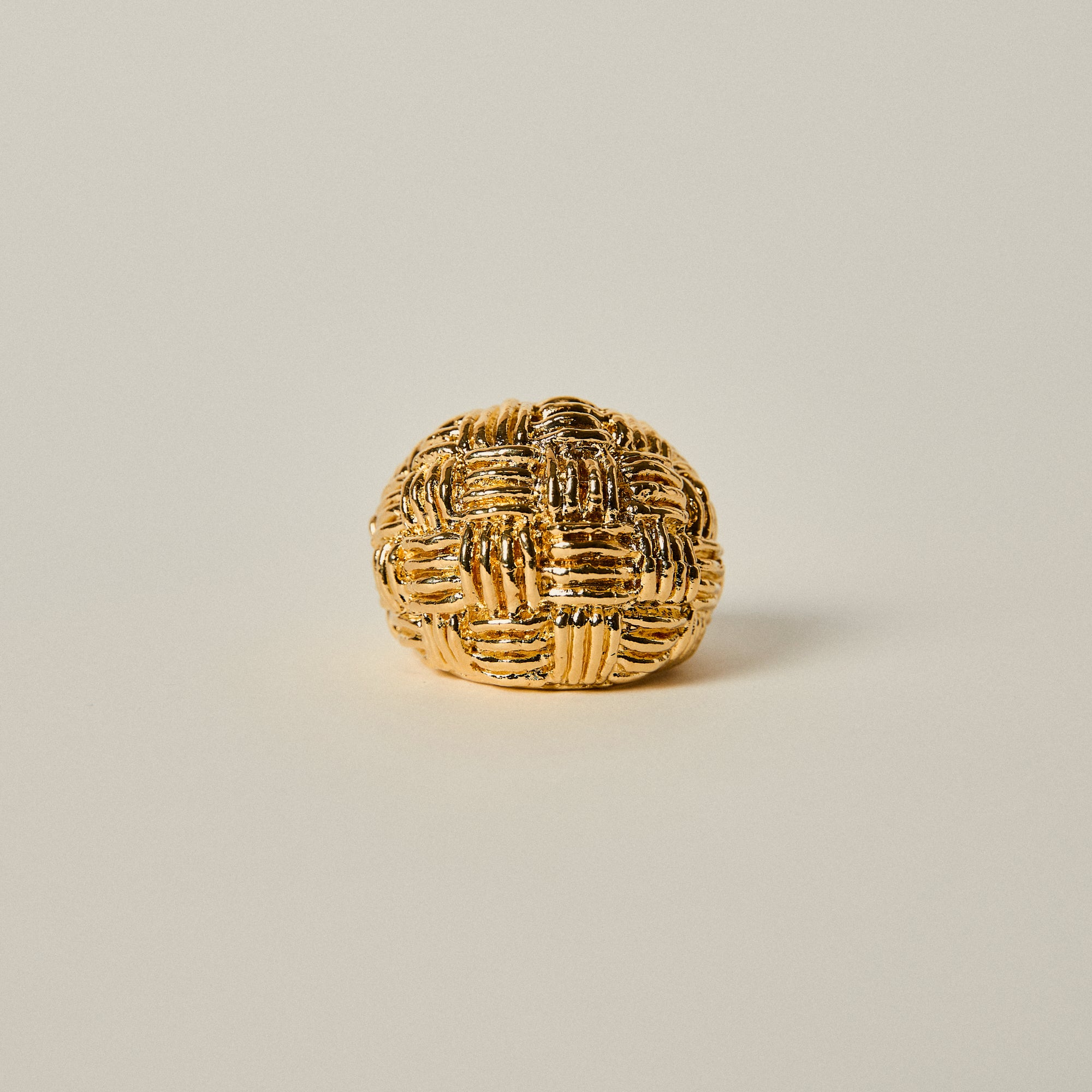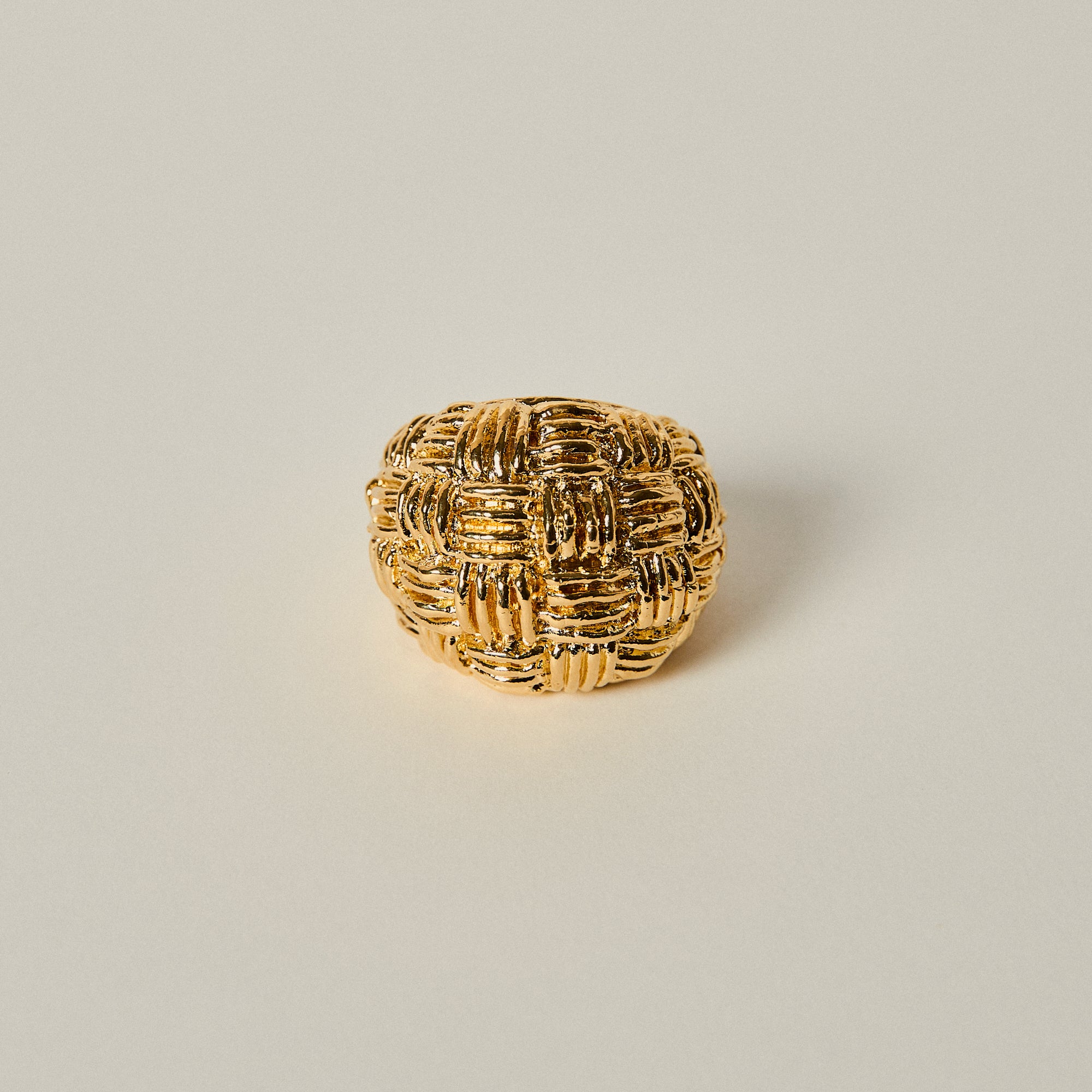 This sculptural dome ring stands out through its intricate woven texture, creating a rich interplay of light and shadow across its surface. Bold yet refined, its rounded volume gives it a strong contemporary presence.