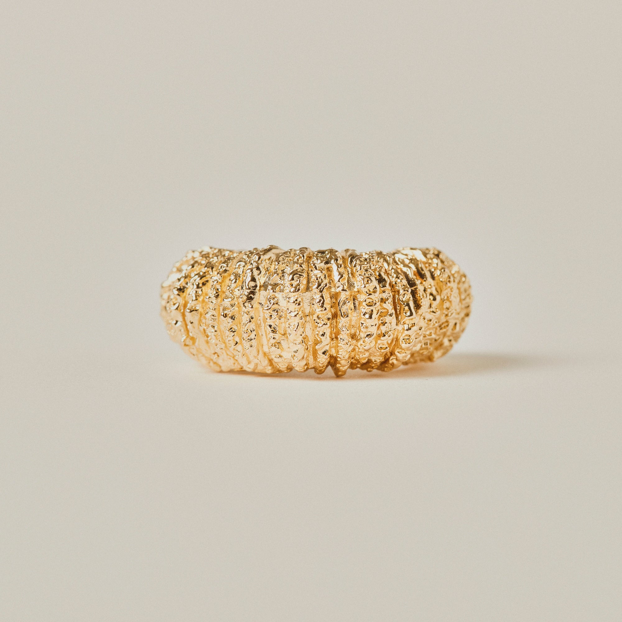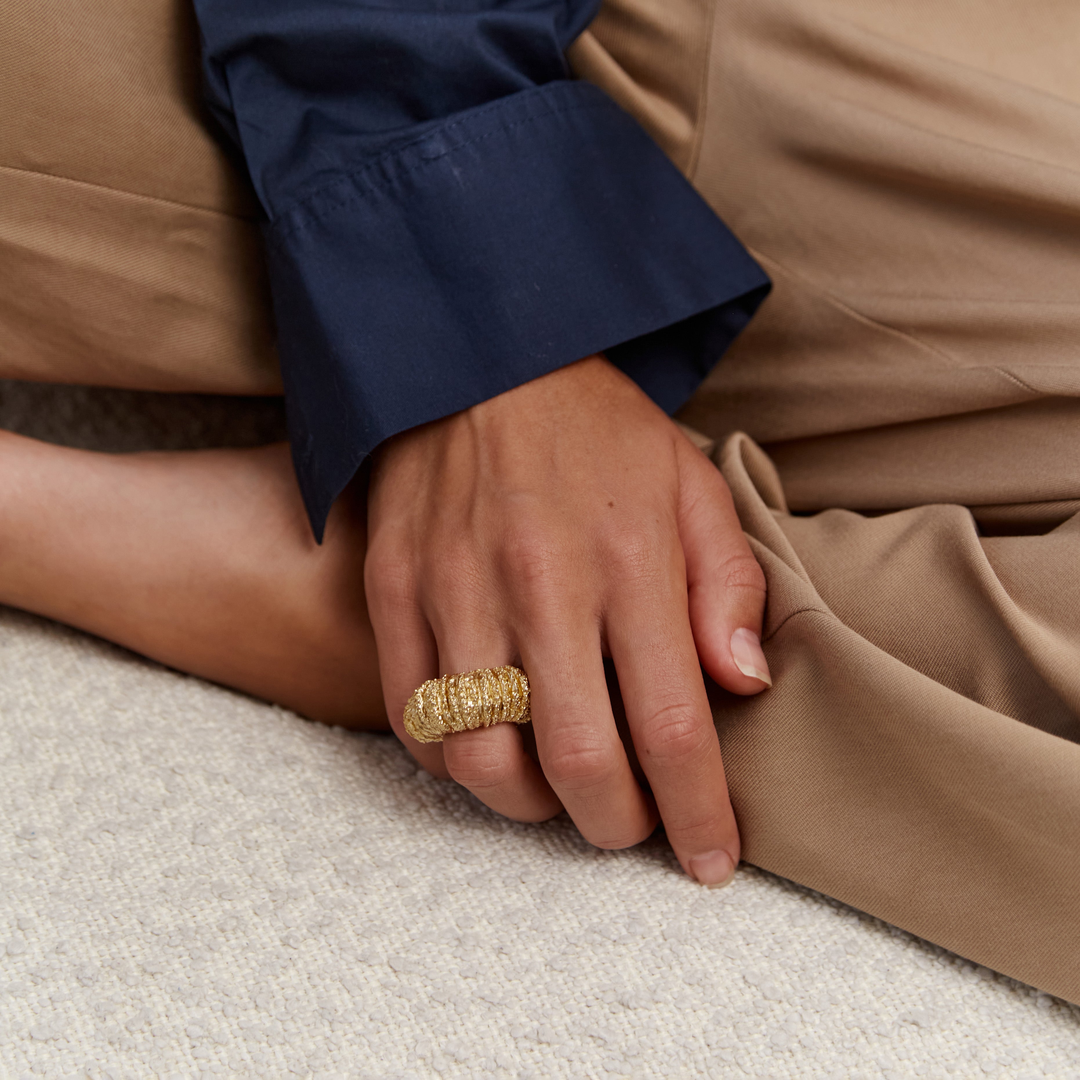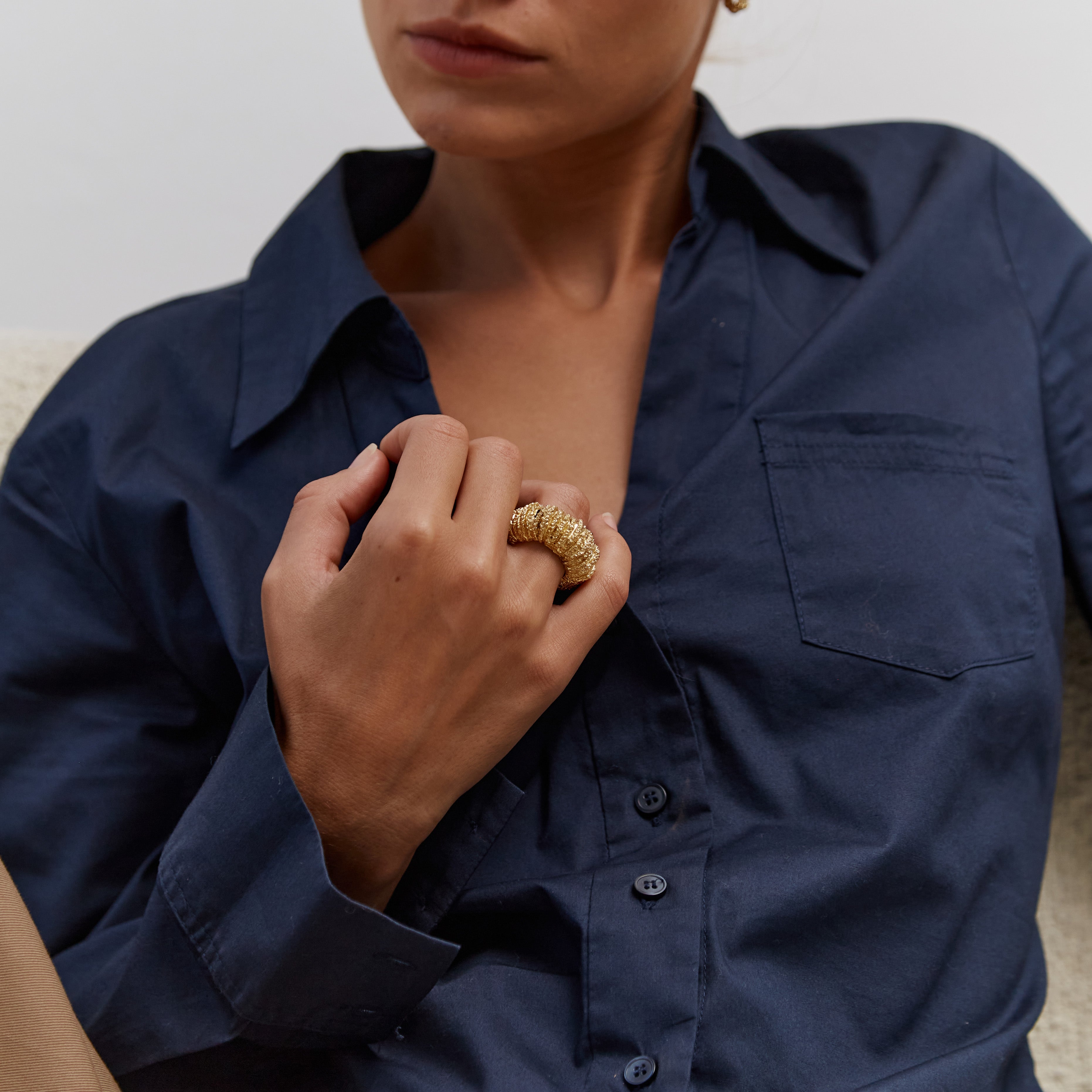 Accentuate your style with this texture handmade ring, expertly crafted in 18kt gold plated pewter metal. Let this ring be a reflection of your unique personality and style, adding a touch of individuality and flair to your ensemble, whether worn alone or stacked with other favorite pieces.