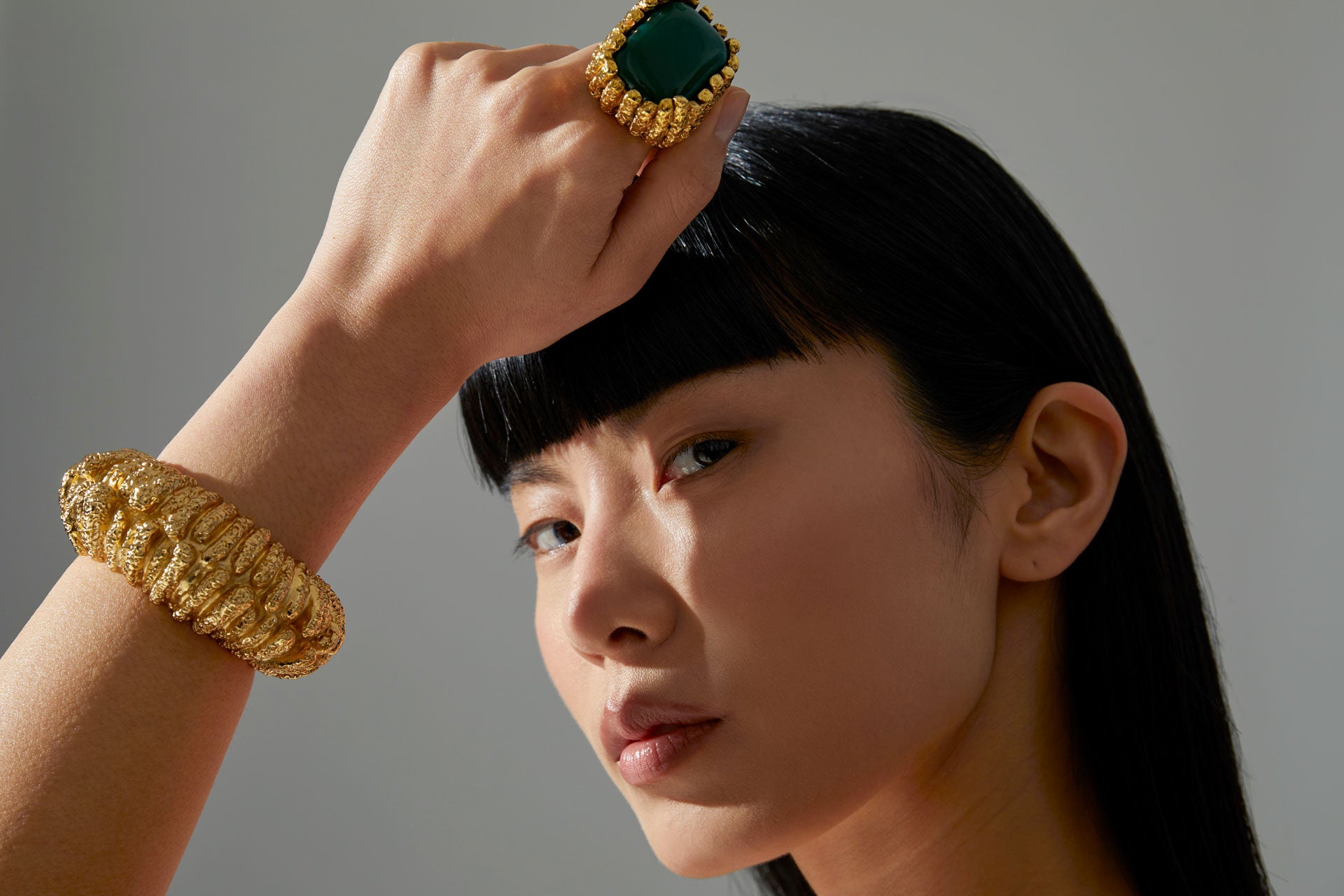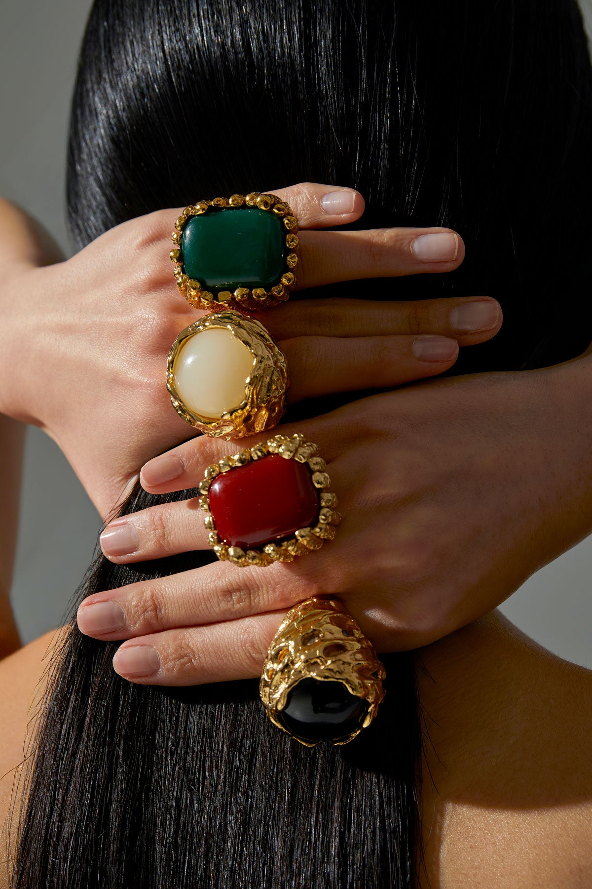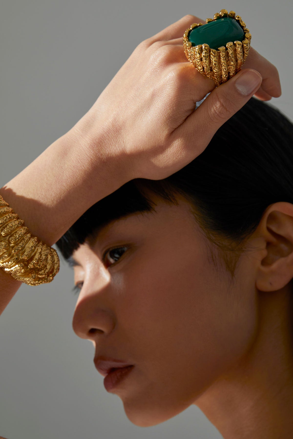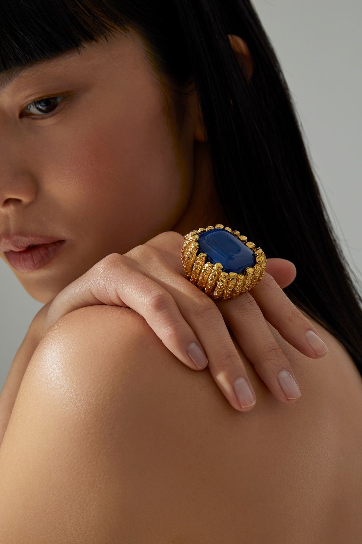 XXL sculptural ring with carved vertical texture and central stone setting.