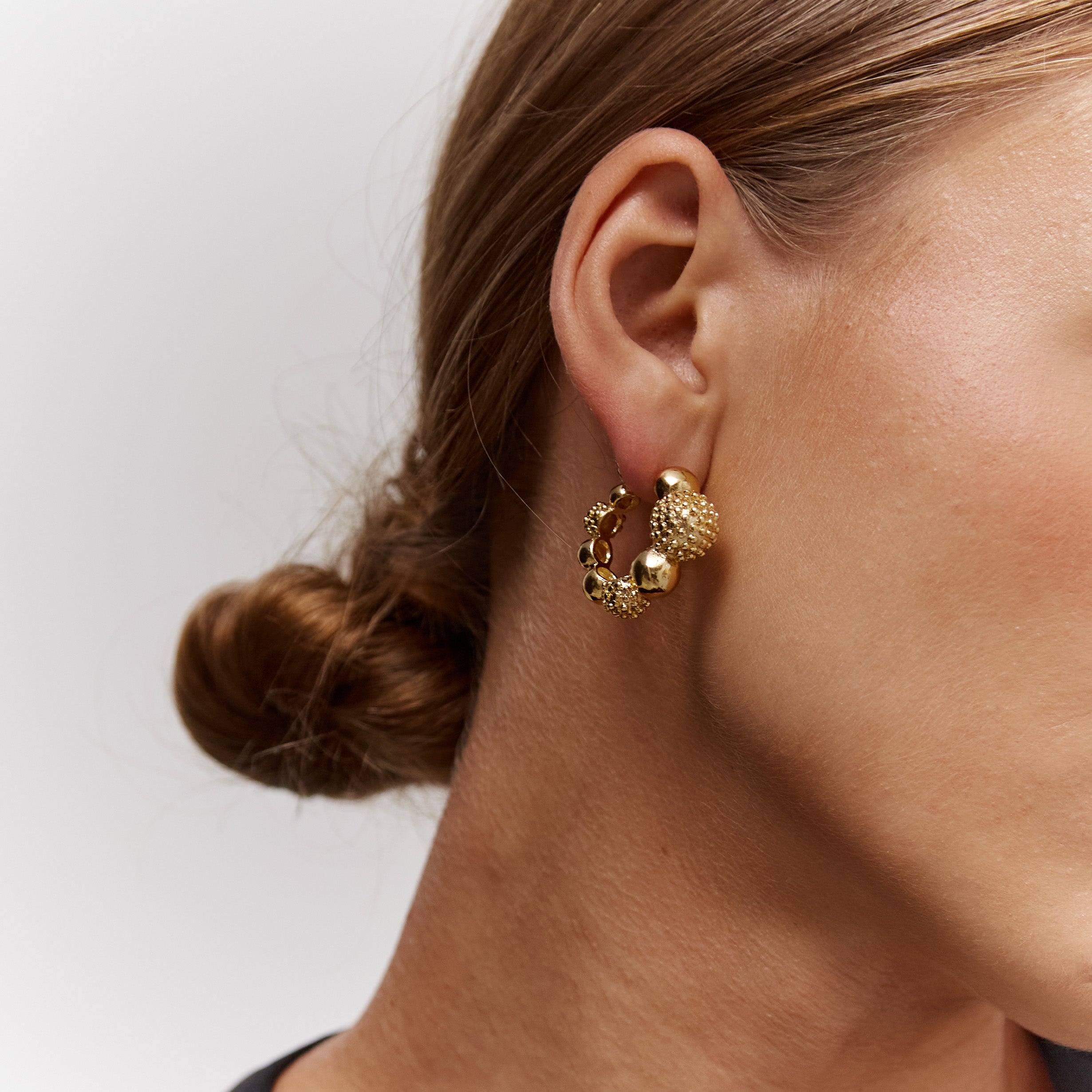Enhance your look with these elegant mini hoops, handmade in 18kt gold plated pewter metal. Let these hoops be your everyday essential, adding a touch of subtle sophistication to any ensemble, while showcasing your unique sense of style and individuality with effortless grace.