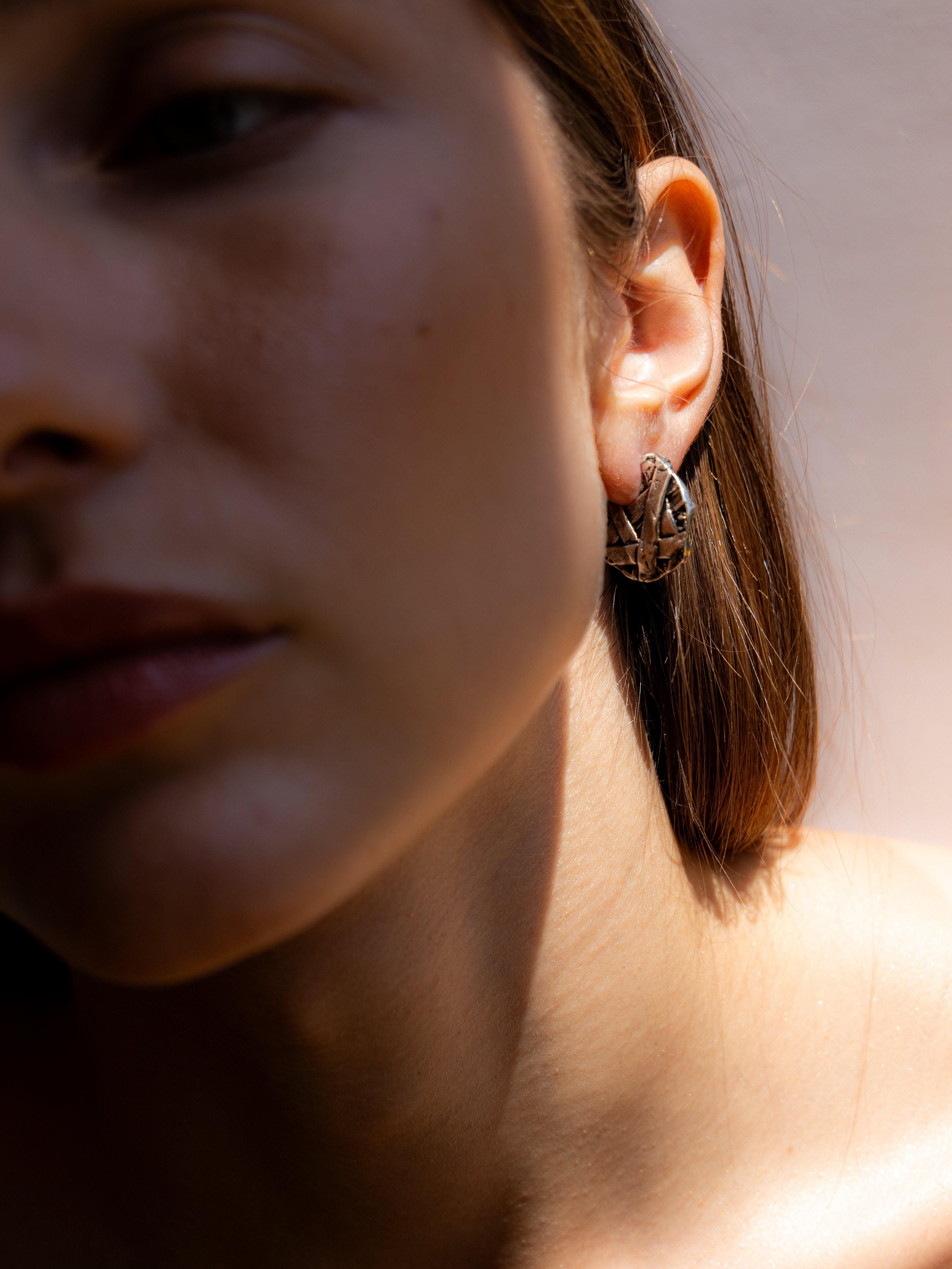 Elevate your ensemble with these exquisite handmade 18kt silver plated pewter metal textured hoops. From boardroom meetings to evening soirées, these hoops effortlessly transition from day to night, adding a touch of understated luxury and elegance to any outfit, ensuring you stand out with confidence and poise.