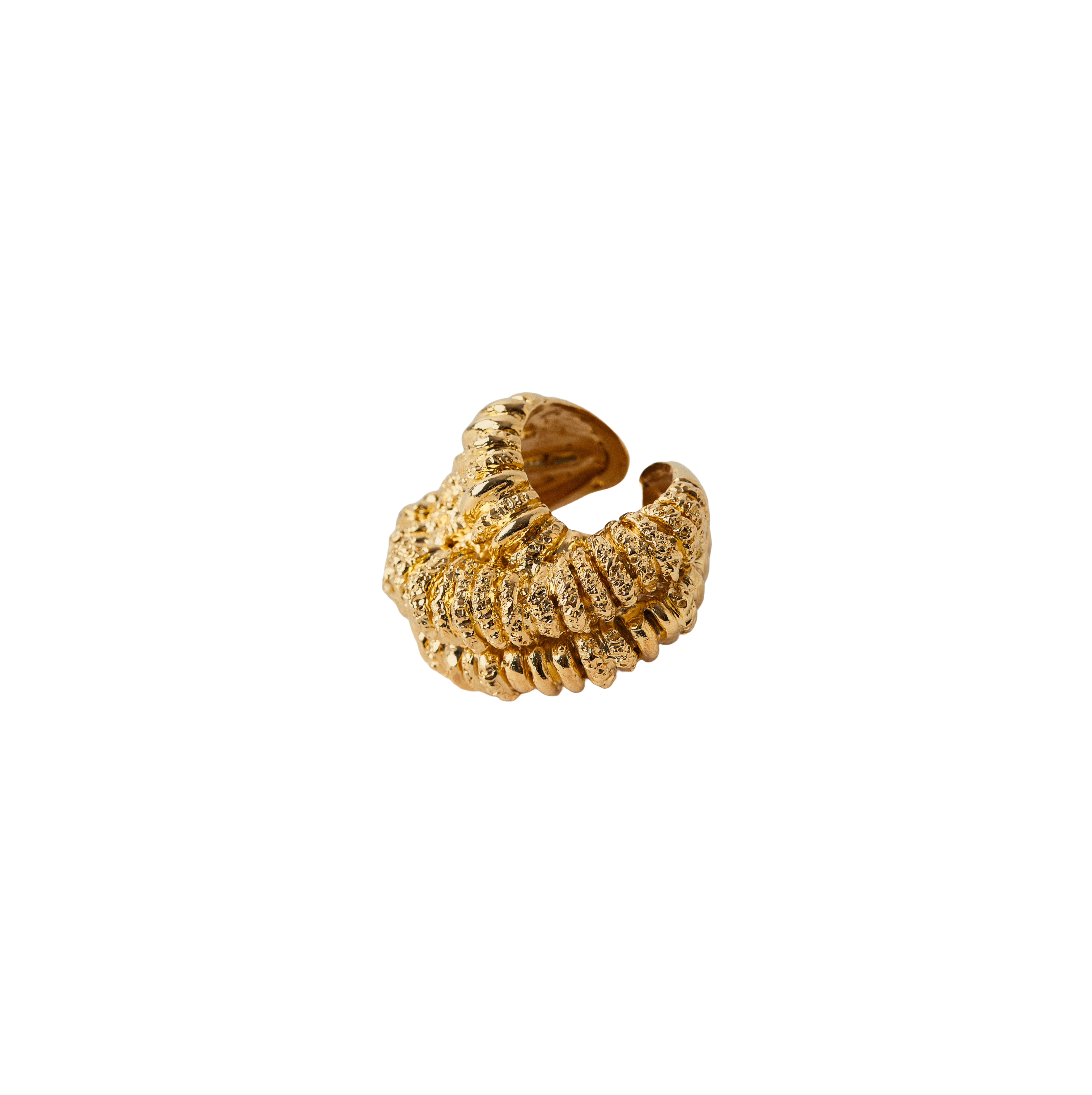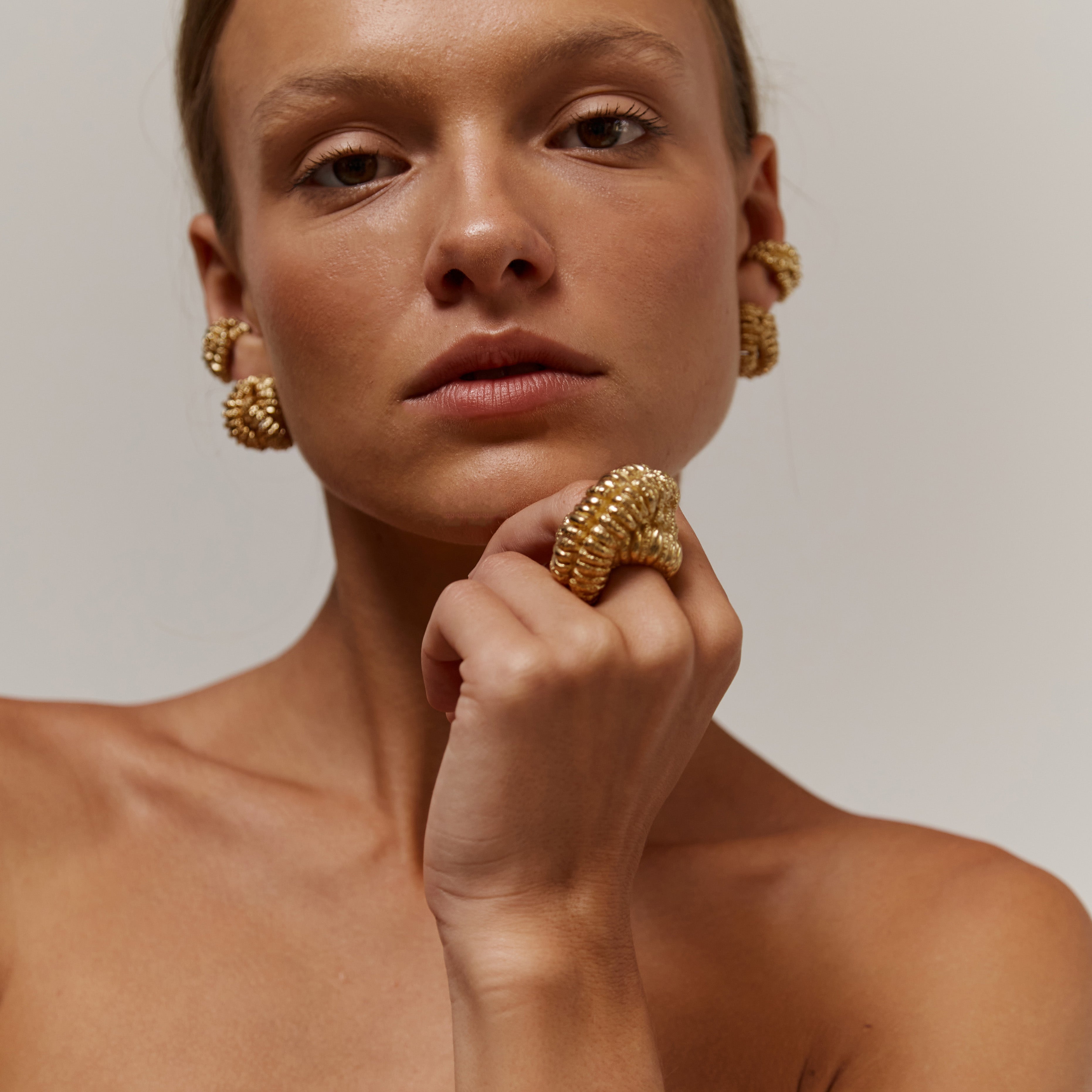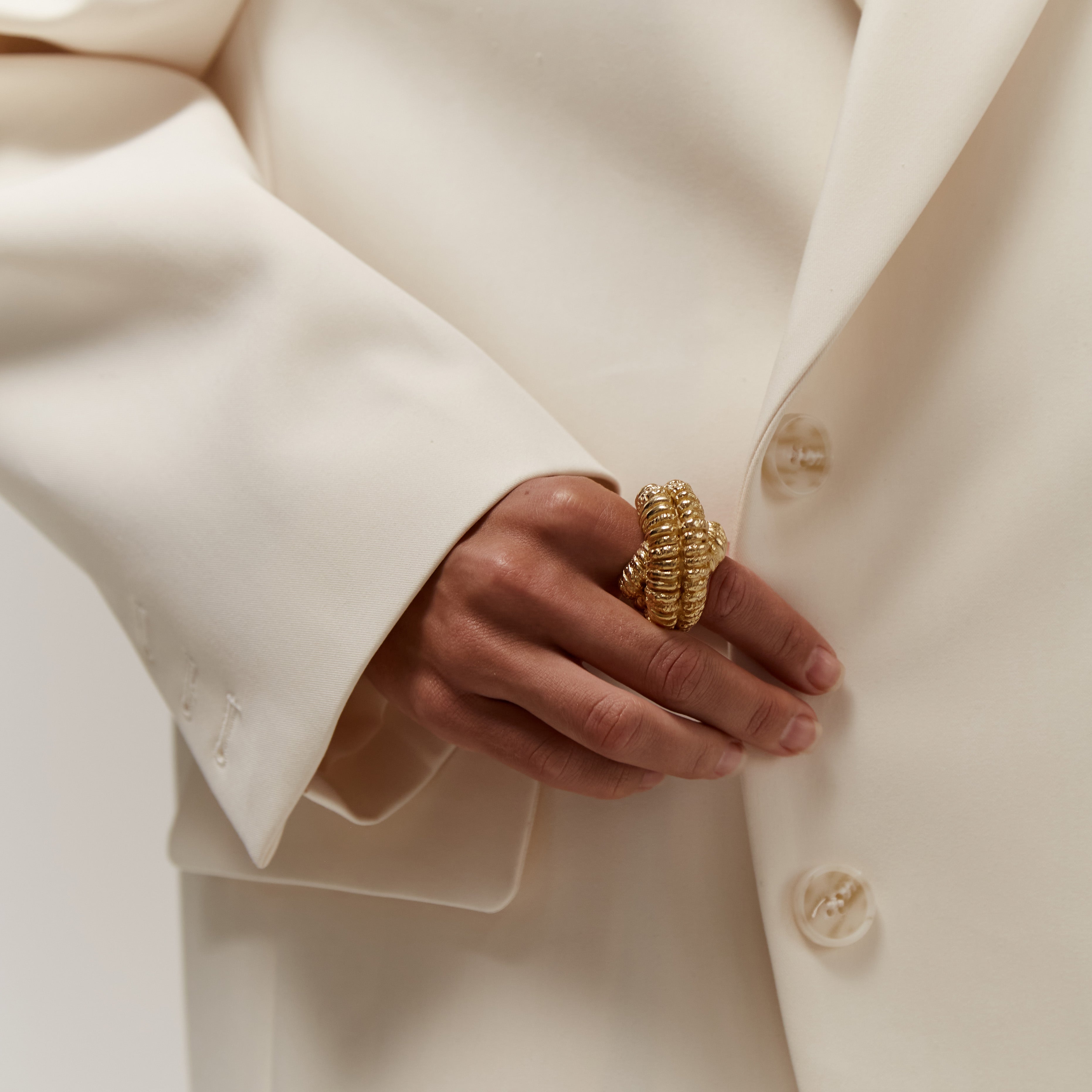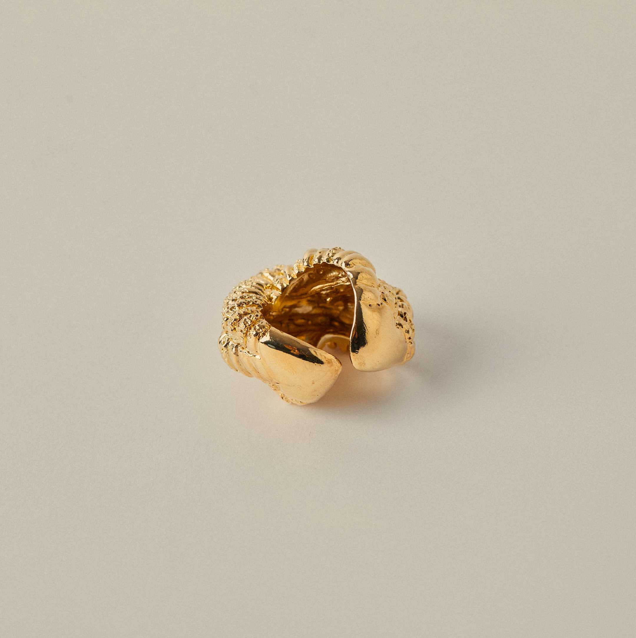 Finish off your look with this handmade 18kt gold plated textured pewter metal knot ring, a symbol of timeless sophistication. Let this ring be a reflection of your refined taste and impeccable style, adding a touch of elegance and grace to any ensemble, whether it's a formal event or a casual outing with friends.